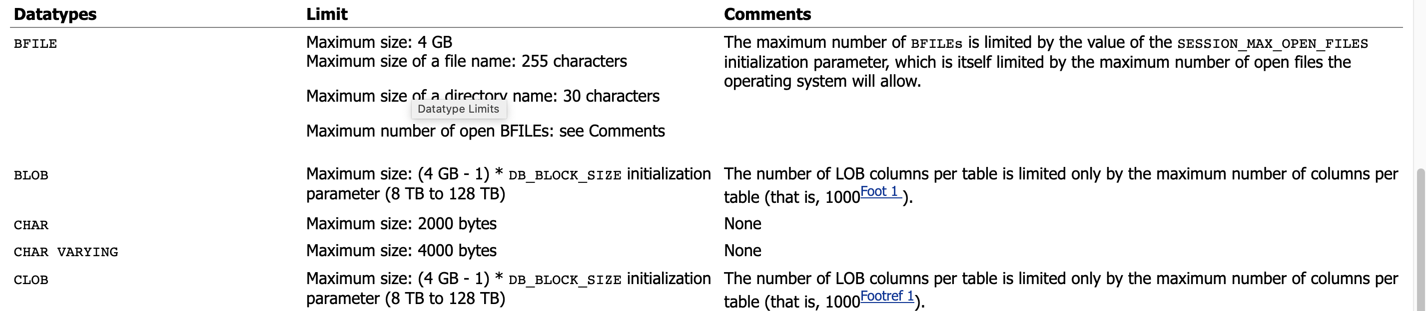 BFILE Maximum size: 4 GB Maximum size of a file name: 255 characters Maximum size of a directory name: 30 characters Maximum number of open BFILEs: see Comments The maximum number of BFILEs is limited by the value of the SESSION_MAX_OPEN_FILES initializati