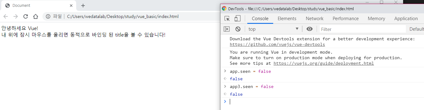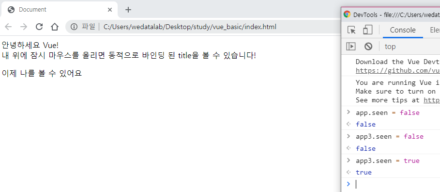2. v-if => 여기 안에 seen 과 같이 특성을 정하면 dom구조를 보이게도 안보이게도 만들 수 있다. 이처럼 구조에도 데이터를 바인딩 할 수 있게 만든다.