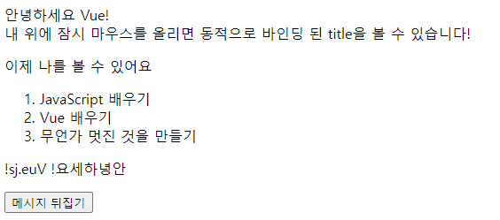 | <div id="app-5"> <p>{{ message }}</p> <button v-on:click="reverseMessage">메시지 뒤집기</button> </div> |