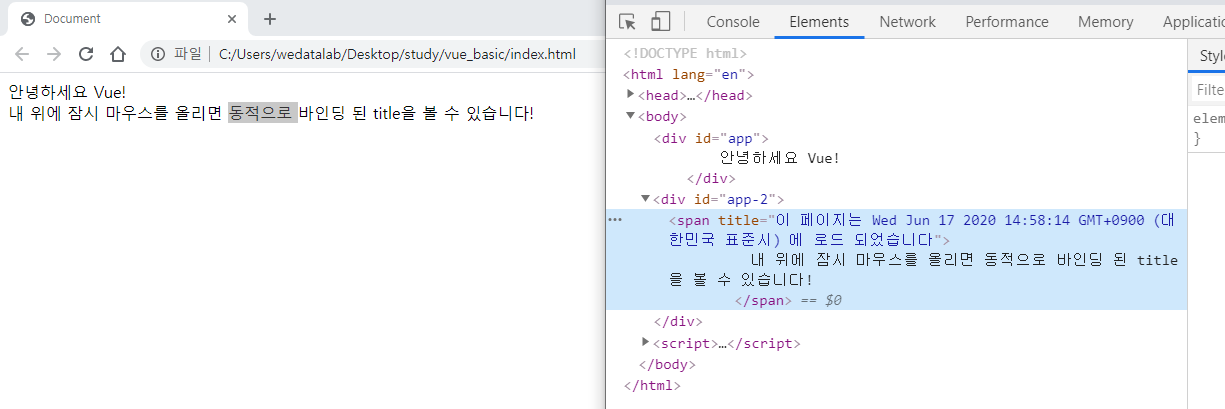 <div id="app-2"> <span v-bind:title="message"> 내 위에 잠시 마우스를 올리면 동적으로 바인딩 된 title을 볼 수 있습니다! </span> </div> var app2 = new Vue({ el: '#app-2', data: { message: '이 페이지는 ' + new Date() + ' 에 로드 되었습니다' } }) |