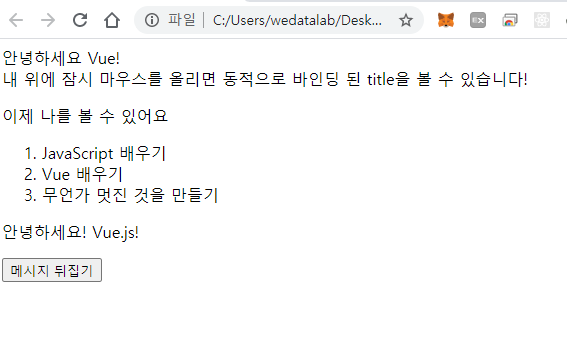 <div id="app-5"> <p>{{ message }}</p> <button v-on:click="reverseMessage">메시지 뒤집기</button> </div> |