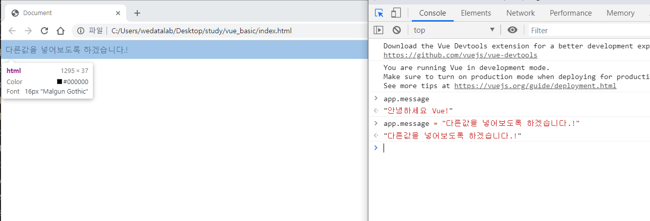 f12를 누르고 개발자 도구를 열어보면 다음과 같이 message라는 데이터에 다른 값을 넣으면 웹페이지에서의 데이터가 똑같이 바뀜을 확인할 수 있습니다.