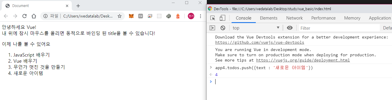 3. v-for => todo in todos 와 같이 v-for = 구문에 두게 되면, todos라는 배열 안의 데이터에 있는 값 만큼 todo를 뽑아서 표시하게 할 수 있다.