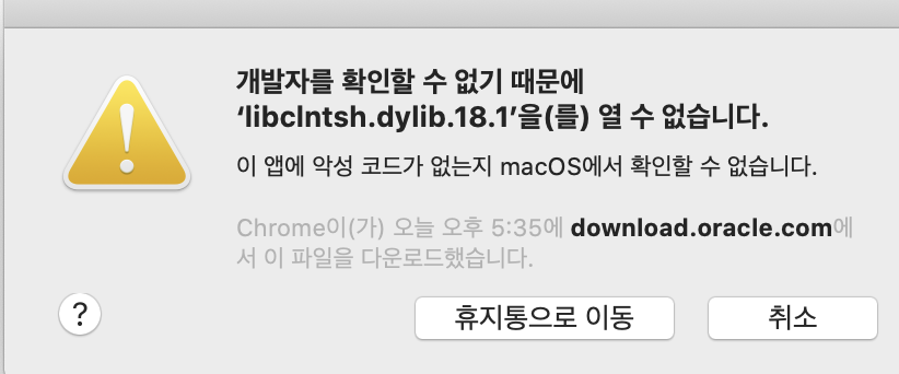 버전을 21에서 18로 다시 받고 문서에 따라서 /usr/local/lib 으로 들어가서 open . 으로 파인더를 열고 넣으니 다음과 같은 메세지가 떴다.