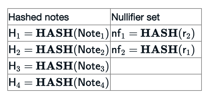 두 값은 모두 해시값의 형태로 되어 있으며, 지캐시는 여태까지 발생한 모든 commitment를 리스트로 보관하고 공개처리에 사용된 nullifier를 저장해 두어서 다시 반복되지 않게 처리한다.