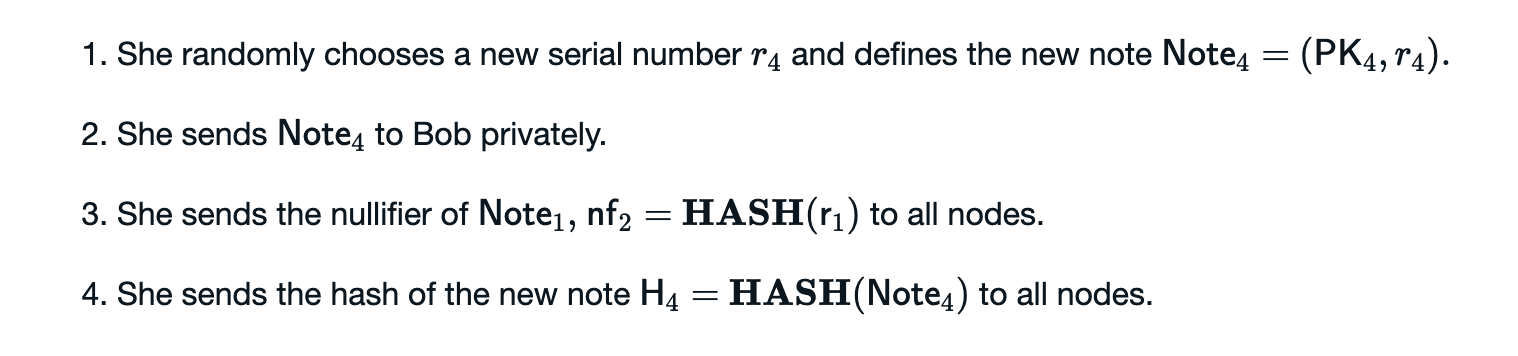 위와 같이 새로운 노트와 Publick Key4와 시리얼 넘버 r4를 프라이빗 채널에서 따로 거래를 한 후 hashed note에 해당되는 H4와 Nullifier에 해당되는 nf2를 모든 유저들에게 공개를 한다. 그러면 공개가 되면서 이전에 사용된 값이 아닌지 체크를 한다.