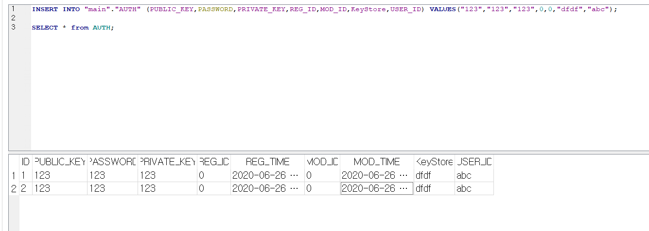 다음과 같이 데이터베이스에는 REG_ID,와 REG_TIME, MOD_ID와 MOD_TIME 이 있다.