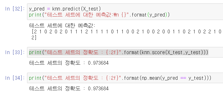 이를 테스트 세트와 훈련 세트로 나누었으며 , 훈련 데이터 X_train 과 훈련 데이터의 레이블 y_train을 매개변수로 하여 fit 메서드를 호출해 모델을 만들었습니다. 그 다음에 score을 메서드에 넣어 97%의 정확도를 얻었습니다. 이는 테스트 세트에 있는 샘플의 97%를 정확히 맞혔다는 뜻입니다.