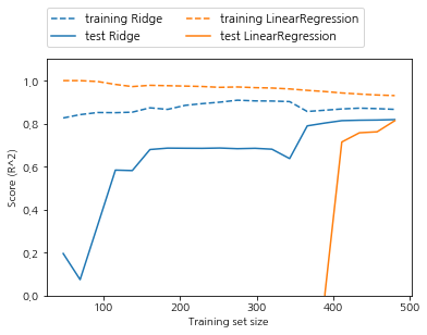 모든 데이터셋에 대해 릿지와 선형 회귀 모두 훈련 세트의 점수가 테스트 세트의 점수보다 높습니다. 릿지에는 규제가 적용되므로 릿지의 훈련 데이터 점수가 전체적으로 선형 회귀의 훈련 데이터 점수보다 낮습니다. 규제를 적용하게 되면서 훈련 데이터의 점수는 낮아지지만 과대적합을 막아주어 테스트의 정확도는 더 높습니다. 특히 더 작은 데이터 셋에서는 파란색 표가 더 유리함을 볼 수 있었습니다. 두 모델 보두 데이터가 많아질 수록 성능이 좋아지는데 데이터를 충분히 주게 되면 규제의 중요성은 낮아져서 결국 릿지회귀와 선형 회귀의 정확도는 같아지게 됩니다. 또 선형회귀의 경우 훈련데이터의 정확도가 데이터가 많아질수록 감소함을 볼 수 있는데 이는 데이터가 많아질 수록 모델이 데이터를 기억하거나 과대적합을 하기 어려워지기 때문입니다.