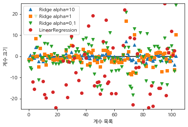 10으로 alpha값을 높여서 기울기를 작게 만들었을 때는 -3~3사이에 계수가 위치한 것을 볼 수 있습니다. 반면 alpha를 1로 만들어서 일때는 계수의 크기가 좀 더 높아짐을 볼 수 있습니다. 그리고 alpha가 0.1이 되면 기울기 즉 계수가 더 커짐을 볼 수 있고 선형 회귀의 경우에는 계수가 더 커져서 그림밖으로 나감을 볼 수 있습니다.