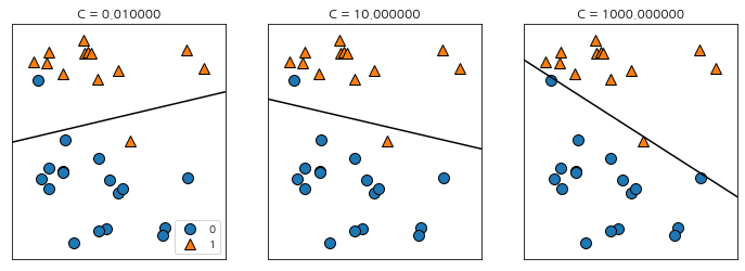이회귀는 릿지와 마찬가지로 L2 규제를 사용합니다. 여기서 과대적합을 막기 위하여 규제의 강도를 정하는 매개변수는 C값입니다. C값을 낮게하면 기울기가 0에 가깝게 만들어져서 규제가 높아지고 C값을 높게 하면 규제가 감소하여 훈련세트에 최대한 맞추려고 합니다. 이는 C값이 낮아지면 다수의 포인트에 맞추고 C값이 높아지면 데이터 개개의 포인트를 정확히 분류하려 노력하려는 것으로도 해석할 수 있습니다.