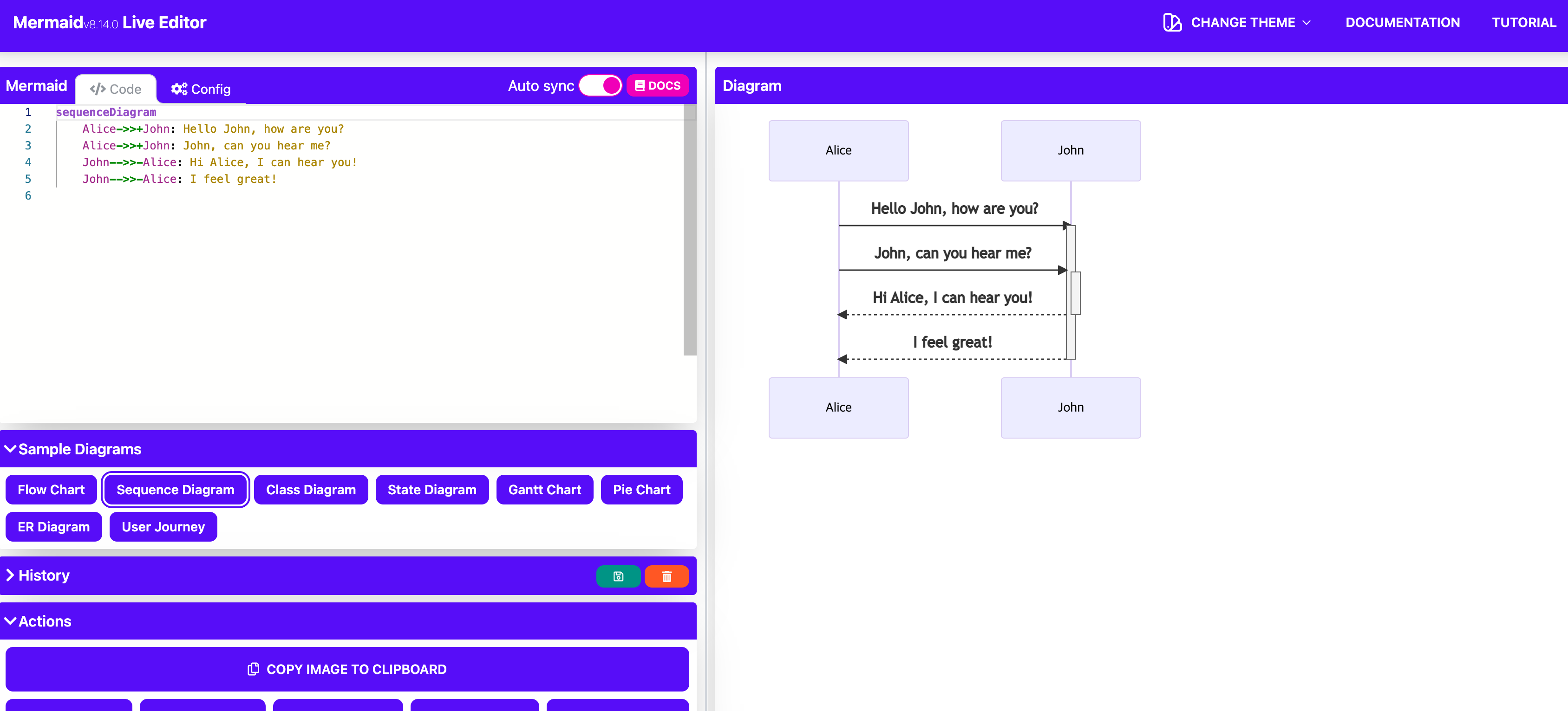 Alice->>+John: John, can you hear me?
