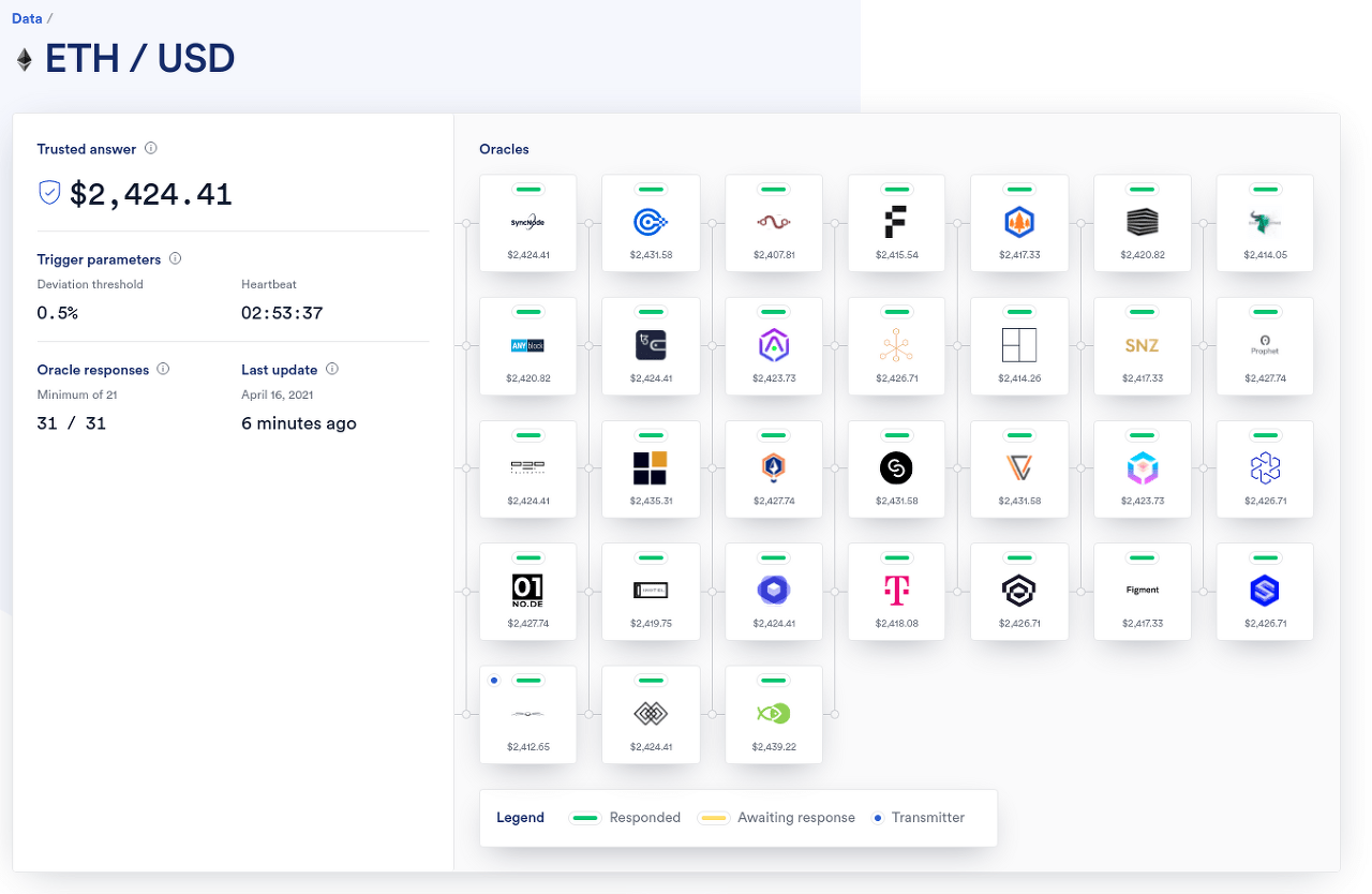 보면 보상을 받고 데이터를 제공해 주는 여러개의 오라클들의 값들이 모여서 하나의 통일된 가격을 보여줌을 알 수 있다.