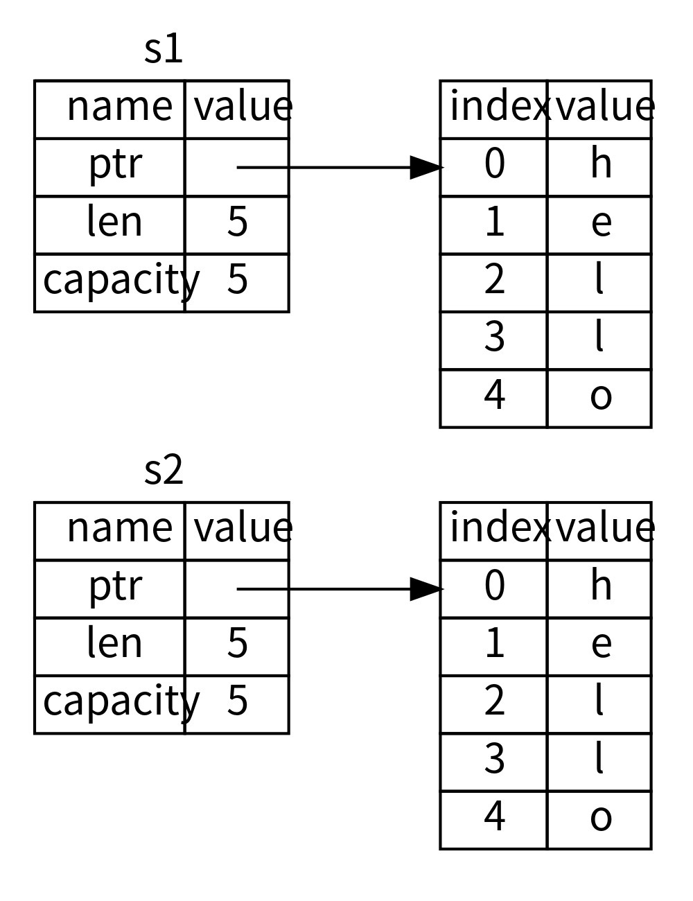 s1을 s2에 할당하게 되면 String의 데이터가 복사되는데 이는 포인터, 길이, 용량이 (스택에 있는) 복사된다는 것을 의미한다. 힙에 있는 데이터는 복사되지 않는다.