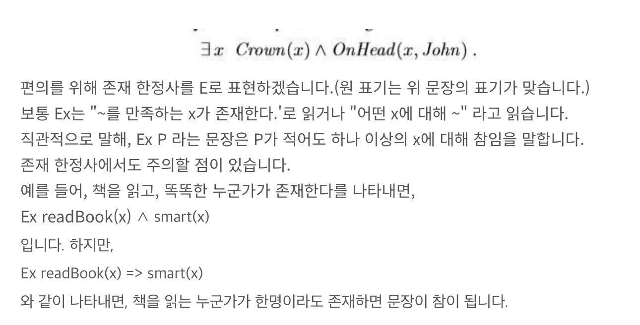 - ∃ (존재 양화자, Existential Quantifier): "어떤 것이 존재하여"라는 의미로, '∃x, P(x)'는 "어떤 x가 존재하여 P(x)가 참이다"라는 의미입니다.