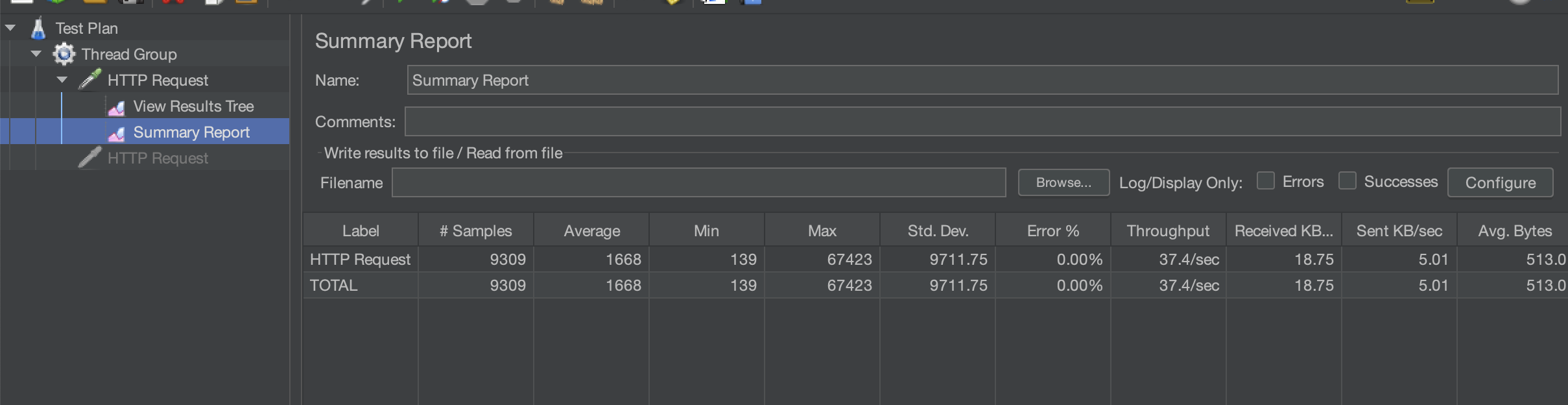 이후 summary report를 눌러보면 여기서 TPS나 응답 시간 등을 모두 측정할 수 있다.