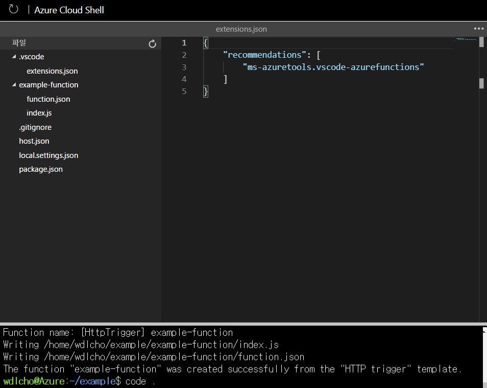 이제 함수 앱이 만들어 졌다면 아까 함수를 만들어둔 example 경로로 들어가서