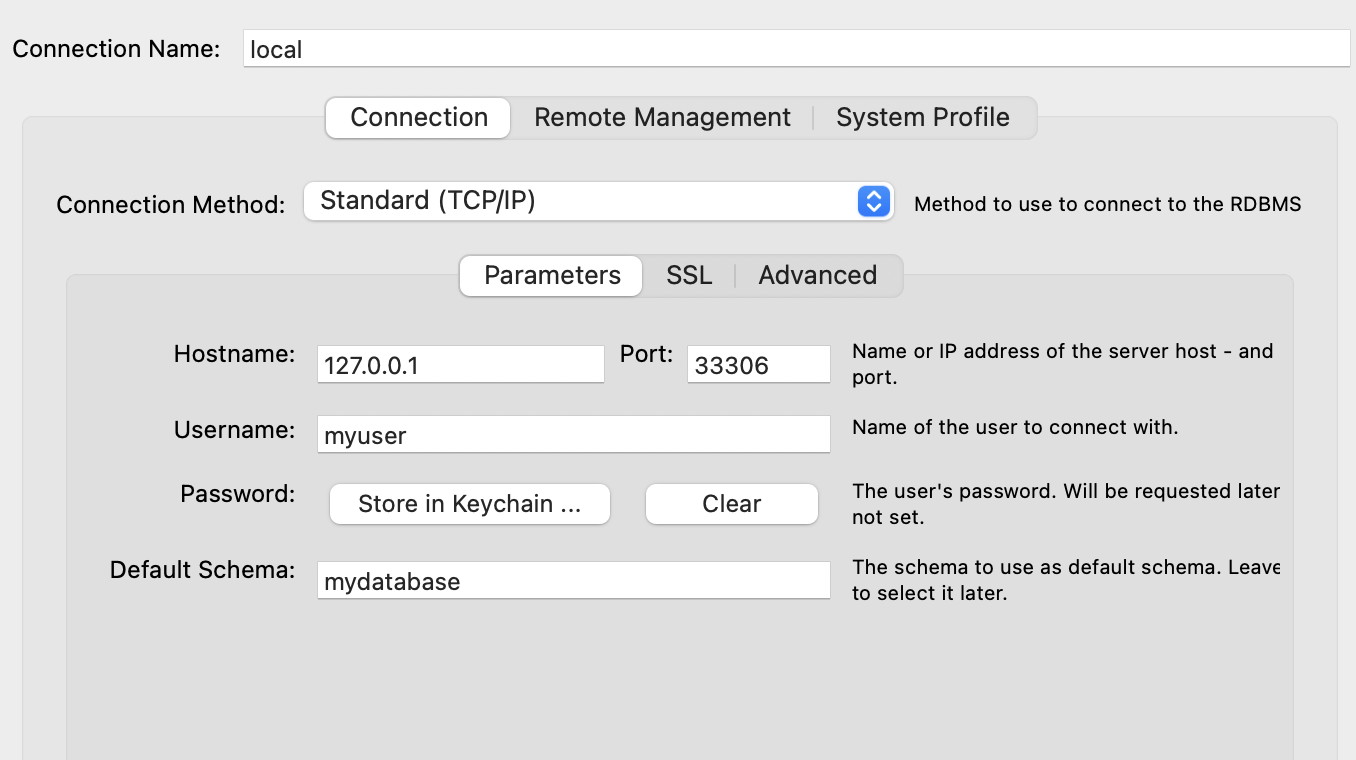 이후 mysql workbench에는 아래와 같이 docker-compose 에서 지정한 접속 정보로 접근해서 사용이 가능하다.