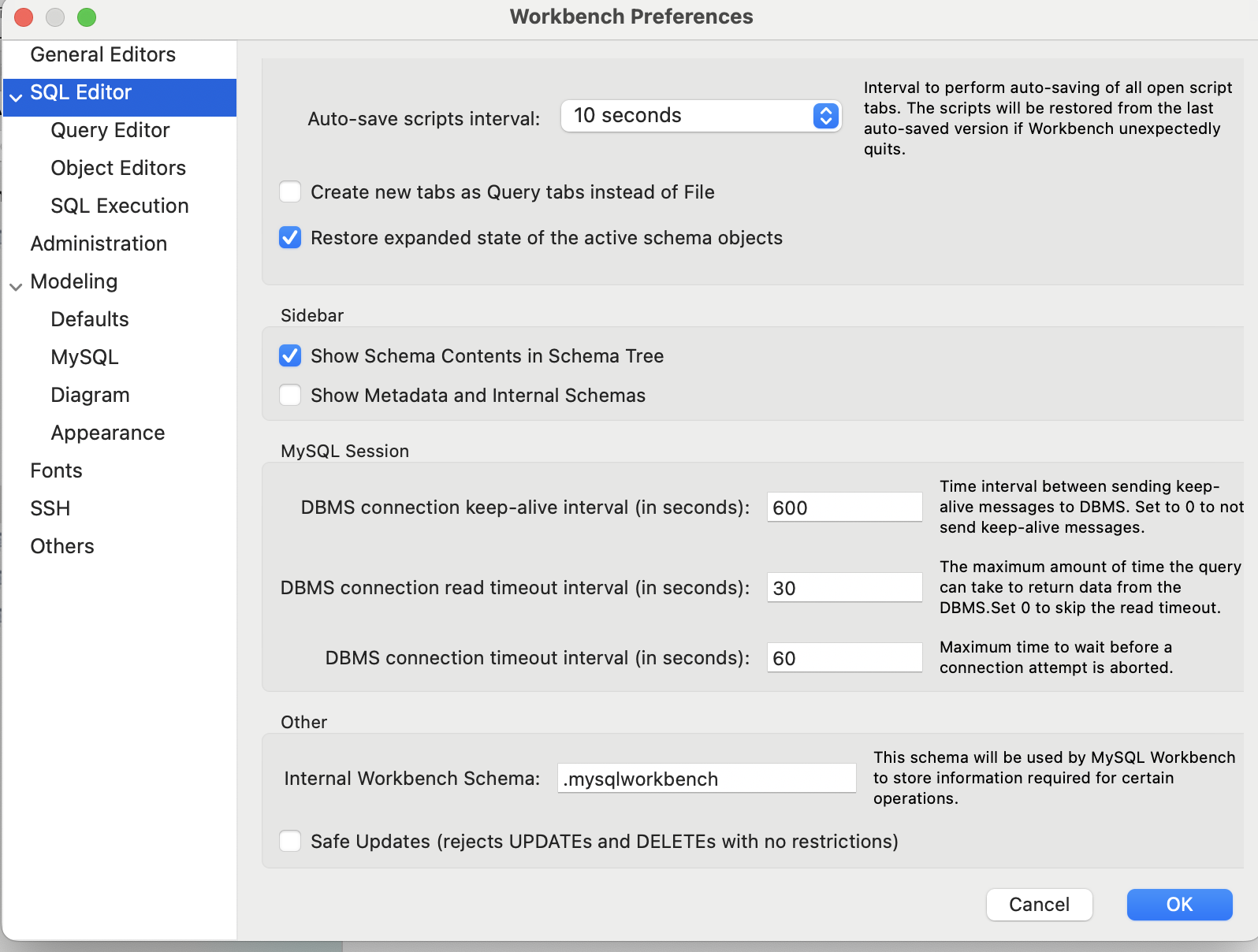 이를 해결하기 위해서는 mysql workbench의 설정값을 바꿔주거나