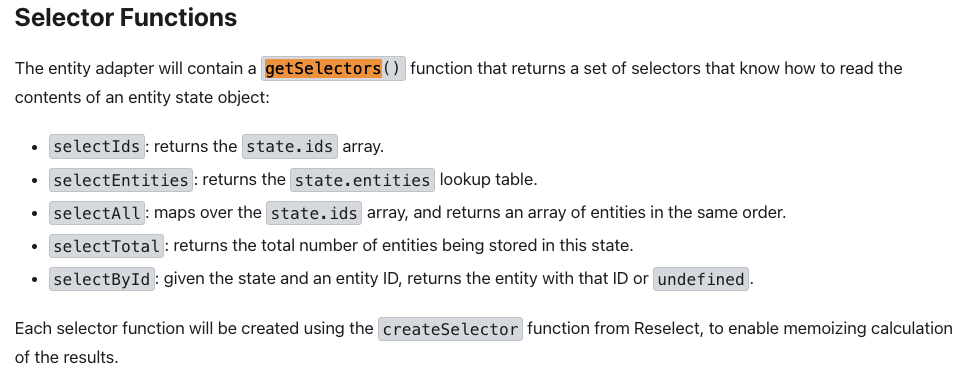getSelector 함수의 경우 entity adapter가 포함하고 있는 함수라고 한다. state를 포함하고 있는객체에 직접 접근하는 기능을 해당 내장 함수에서 한다고 보면 된다.