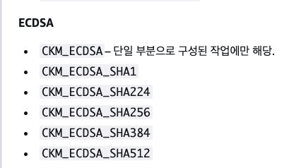 | CKM_ECDSA | 해싱을 포함하지 않음 – "해시를 직접 넣어야 함" |