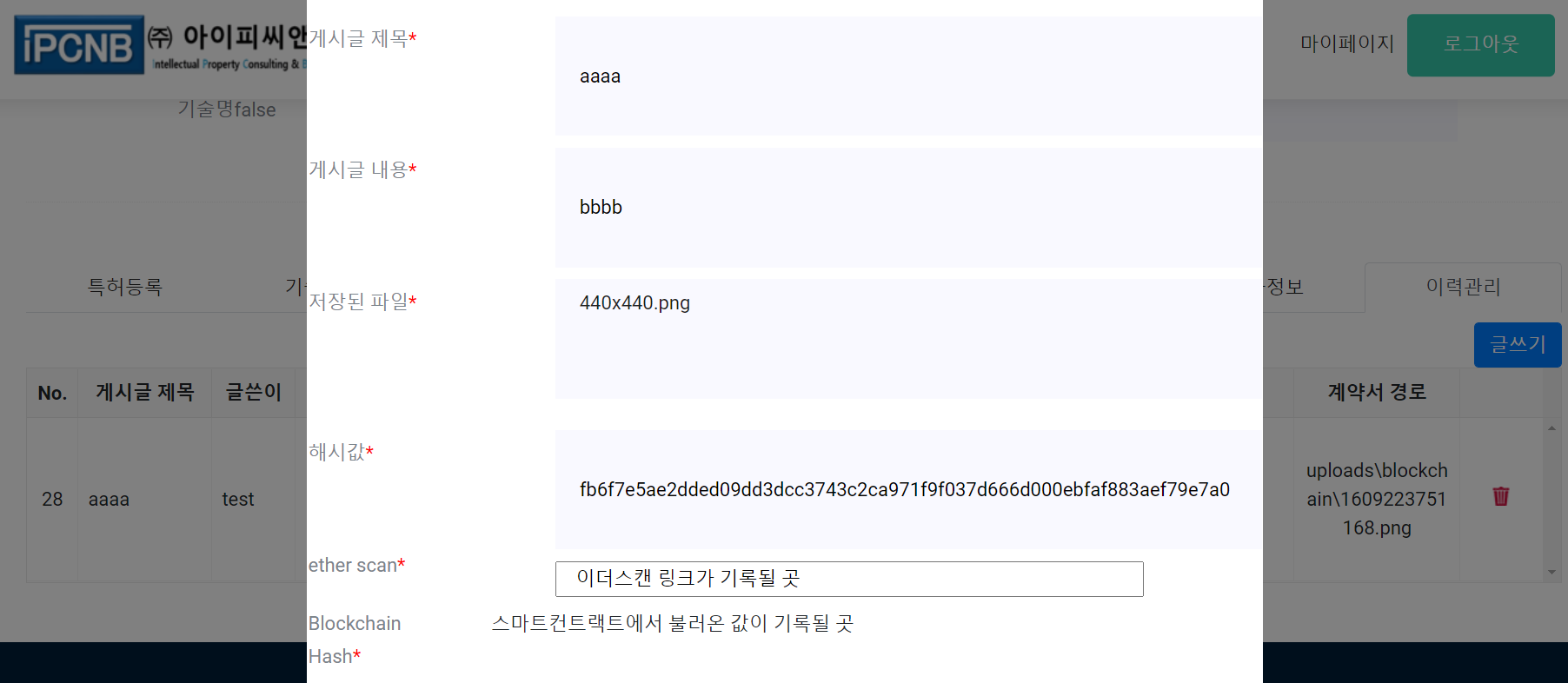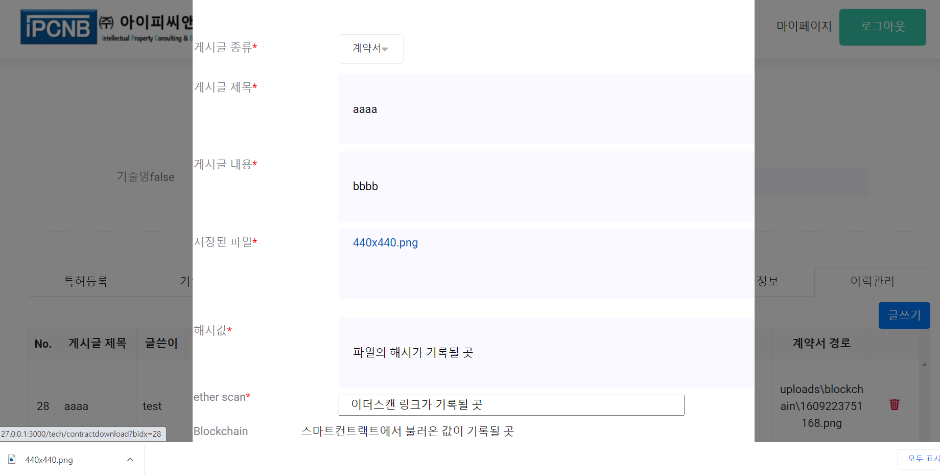 이렇게 파일의 원문을 확인할 수 있고, 파일로 부터 추출한 해시값을 DB에서 기록한후 보여주고 블록체인에서 보여줌과 동시에 이더스캔 링크까지 걸어두면 DB와 이더리움 저장공간을 유저입장에서 쉽게 비교하여 이해시켜 줄 수 있다.